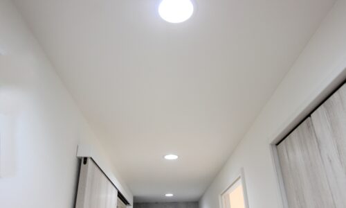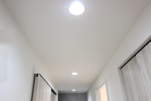 今回の現場では、廊下の「手前」と「奥」の2箇所に、天井埋込型のLEDダウンライトを新設するプランを採用しました。